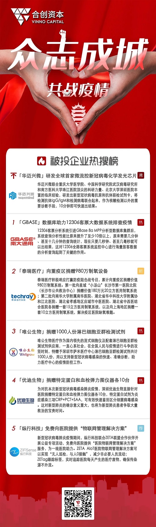新型冠狀病毒肺炎疫情牽動(dòng)人心,防疫、抗疫仍在緊張進(jìn)行···但隔離不隔愛,封城不孤城。合創(chuàng)資本投資的華邁興微、泰瑞醫(yī)療、優(yōu)迪生物、南大通用、縱行科技等企業(yè),在疫情爆發(fā)之初就自發(fā)加入這場(chǎng)疫情防控阻擊戰(zhàn),利用自身在病毒檢測(cè)、大數(shù)據(jù)排查、制氧系統(tǒng)、物聯(lián)網(wǎng)管理等領(lǐng)域的科技優(yōu)勢(shì)發(fā)揮積極作用。
